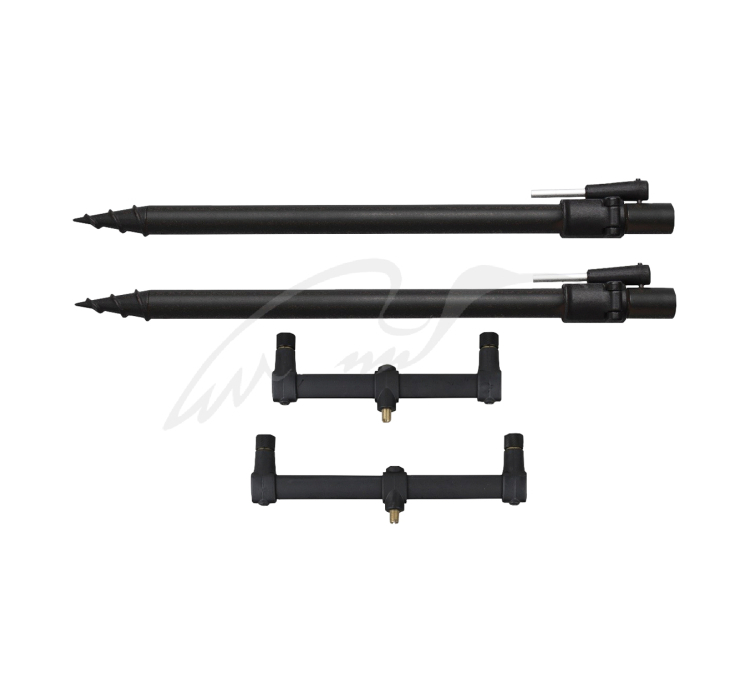 В комплект входят телескопические стойки высотой от 40 до 60 см, оснащенные заостренным концом с резьбой для надежного закрепления в почве. Пара буз-баров длиной 20 и 24.5 см позволяет удобно и надежно располагать удилища на берегу.