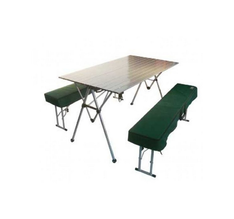 Стол и скамейки выполнены из прочных и легких материалов, что гарантирует их долговечность и удобство в транспортировке. Ножки скамеек имеют дополнительные соединения для увеличения устойчивости, а съемные тканевые чехлы обеспечивают комфорт и легкость в уходе.
