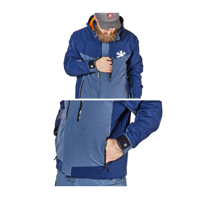 Костюм изготовлен из двухслойного мембранного материала Toray Dermizax, поставляемого из Японии. Этот материал обеспечивает водонепроницаемость до 20000 мм и дышащую способность до 10000 г/м²/24час, что гарантирует защиту от влаги и ветра, сохраняя при этом комфортный микроклимат внутри.