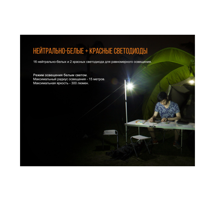 Весом всего 91 грамм и длиной 72 миллиметра, этот фонарь легко переносится, что делает его незаменимым дополнением к вашему снаряжению для активного отдыха. С 16 белыми и 2 красными светодиодами фонарь предлагает 6 рабочих режимов, обеспечивая универсальное освещение, будь то внутри палатки или на прогулке в темноте. Фонарь ярко светит с световым потоком 300 люмен и безопасно освещает расстояние до 15 метров.