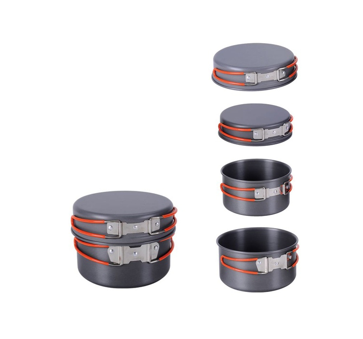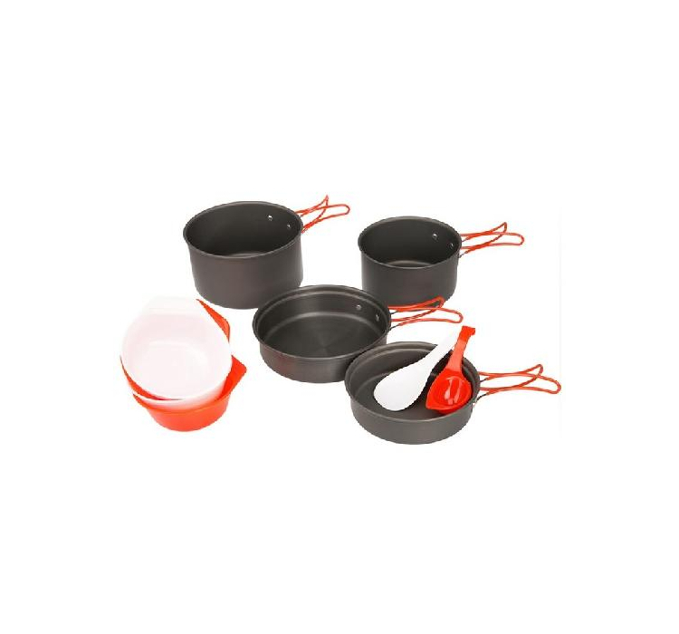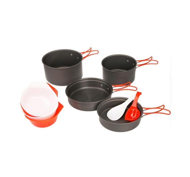 В набор входят две сковороды разного размера, два котелка, четыре миски, лопатка и половник. Сковороды можно использовать в качестве крышек для котелков, что экономит место и делает набор еще более компактным.