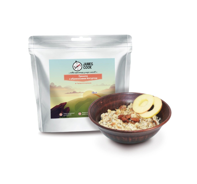Овсянка с абрикосовым йогуртом от James Cook приготовлена из отборных ингредиентов: овсяных хлопьев, абрикосового йогурта, яблочного пюре, миндаля, меда, сухого молока и соли. Никаких искусственных добавок и ГМО!