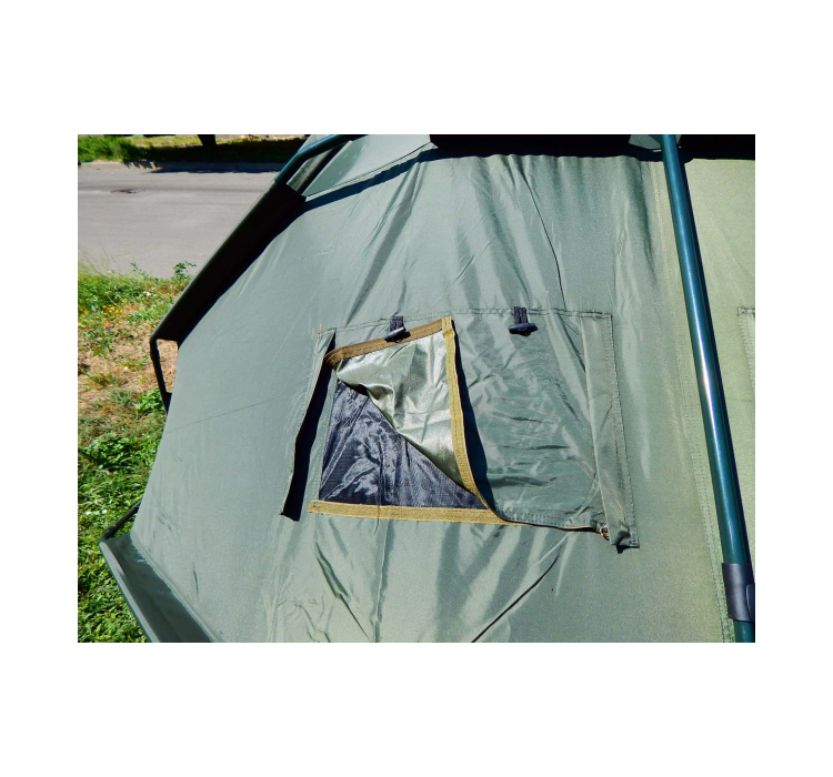 Передняя часть палатки оснащена двумя окнами с защитными сетками против насекомых и опциональной прозрачной дверью. Это обеспечивает отличную вентиляцию и освещение внутри палатки.