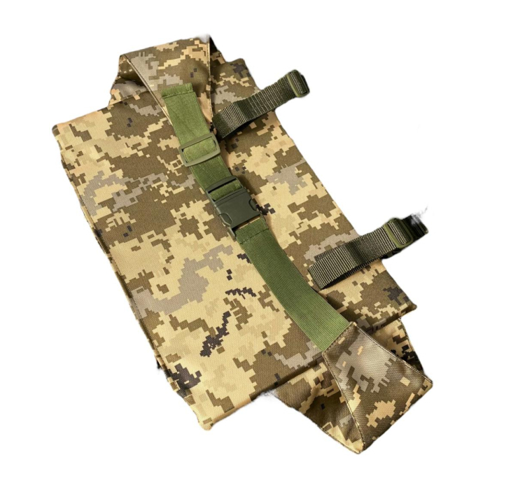 Данная модель имеет клапан на липучке для того, чтобы достать наполнитель, и чтобы была возможность глажка чехла. Есть два вида крепления: резинка на фастексы для крепления на пояс, и стропа с силовой кнопкой для крепления на ремень или РПС. Очень удобно крепится с помощью резинки с карабином, регулируется длина.