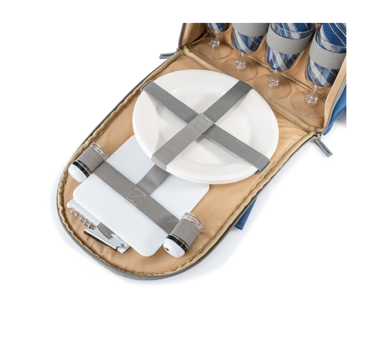Набір включає легкий та зносостійкий посуд та прибори, виготовлені з харчової сталі та високоякісного пластику - 4 ложки, 4 виделки, 4 ножі з пластиковими ручками, 4 міцних бокали та 4 серветки з натуральної бавовни. Також у комплекті: дощечка для нарізання та ємності для солі та перцю. Зручність використання гарантує інтегрована відкривачка з функцією штопора.
