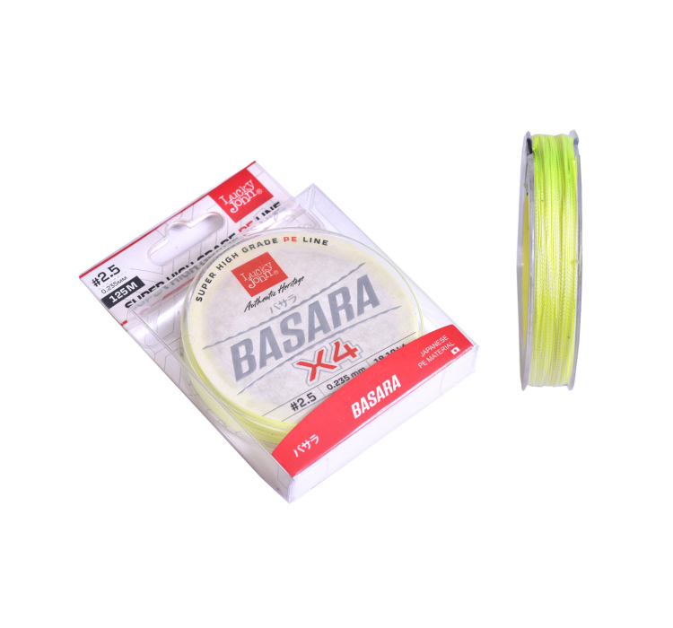 Плетений шнур Lucky John Basara - це чотирижильна плетінка світло-зеленого кольору, яка виробляється за японською технологією з високомодульного поліетилену. Цей шнур має підвищену міцність та зносостійкість, а також невеликий діаметр у поєднанні з високим розривним навантаженням до 19,1 кг.