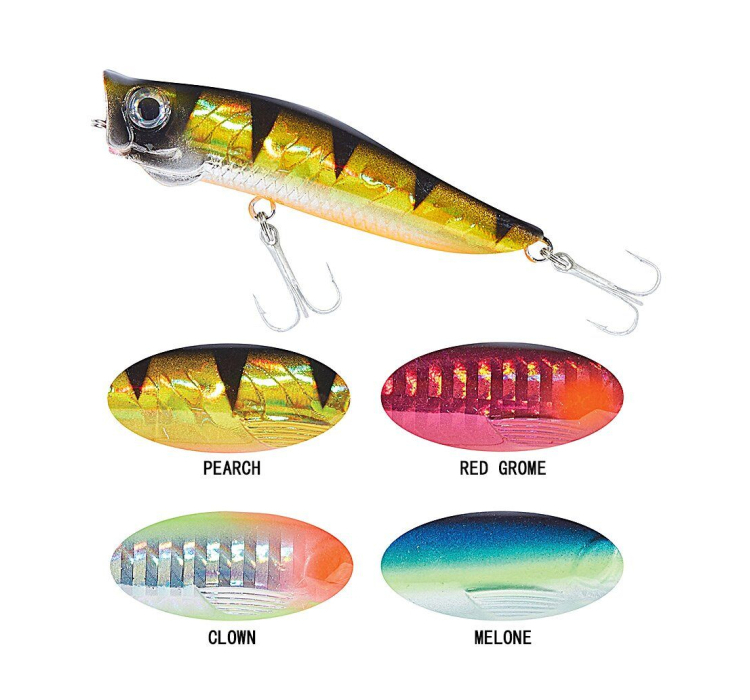 - Унікальна Конструкція: Увігнута голівка воблера створює ляскаючі звуки та розсіює воду, приваблюючи хижаків.